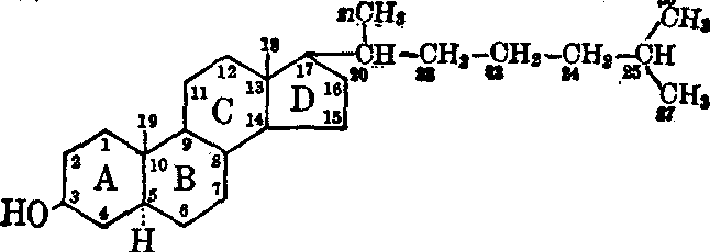 | 释义 | 固醇sterol见“甾醇”。 固醇又称“甾醇”。甾类化合物。以环戊烷多氢菲为基本结构称甾核。在甾核的第3位上有一个羟基,第17位上有一个含8个或更多碳原子的脂肪族侧链。自然界中固醇常与较高级的脂肪酸发生酯化。常见的是胆固醇。 固醇 固醇固醇虽是类固醇中的一类,但体内的类固醇物质均由固醇,尤其是由胆固醇衍生而来。它们都含有一环戊并菲核心结构,常与脂肪并存于生物体中。当皂化后,它们留在“不皂化”的部分,从而可与脂肪分离。 二氢胆固醇结构式 ![]() 二氢胆固醇的立体构象式 从上面二式中可以看出,三个六碳环是以菲分子中的形式排列的,其3位上有一羟基,10及13位上各连一甲基,以及17位上连有一条八个碳原子的侧链;还可看出,碳原子3,5,8,9,10,13,14,17及20等为九个不对称中心,其上连接的原子或基团,如伸向纸平面之上者,应以实线表示,称作β型。而在纸平面之下者,则用虚线表示,称作α型。如此看来,碳原子3上的羟基,8上的氢原子,10及13上的甲基,以及17上的侧链均为β型。若碳原子5上的氢与10上的甲基均在纸平面的同一侧时,A环对B环就是顺型构型,又称正型构型;当二者不在同一侧时,两环之间则为反型构形,又称别型构形。从构象式中可以看出,B环与C环是以椅式反型将A环及D环牢固地并合起来。 体内最重要的固醇、胆固醇,与二氢胆固醇不同之处,只在碳原子5与6之间有一双键而已。真菌(如酵母)中最常见的麦角固醇,不仅在碳原子5与6之间有一双键,在7与8之间还有一双键,这点与7脱氢胆固醇相同;它们在紫外线照射下,分别可转变为维生素D2及D3。麦角固醇的侧链比胆固醇的多一个碳原子,而且在碳原子22与23之间多了一个双键。植物固醇中,以谷固醇及豆固醇为最常见者,其基本结构与胆固醇的相同,只其侧链是由十个碳原子组成,而豆固醇的侧链在碳原子22与23之间也有一个双键。 体内从胆固醇衍生出的多种类固醇的基本结构与胆固醇的大致相同,可参见胆汁酸、皮质激素及性激素等条。 表1 重要的天然固醇