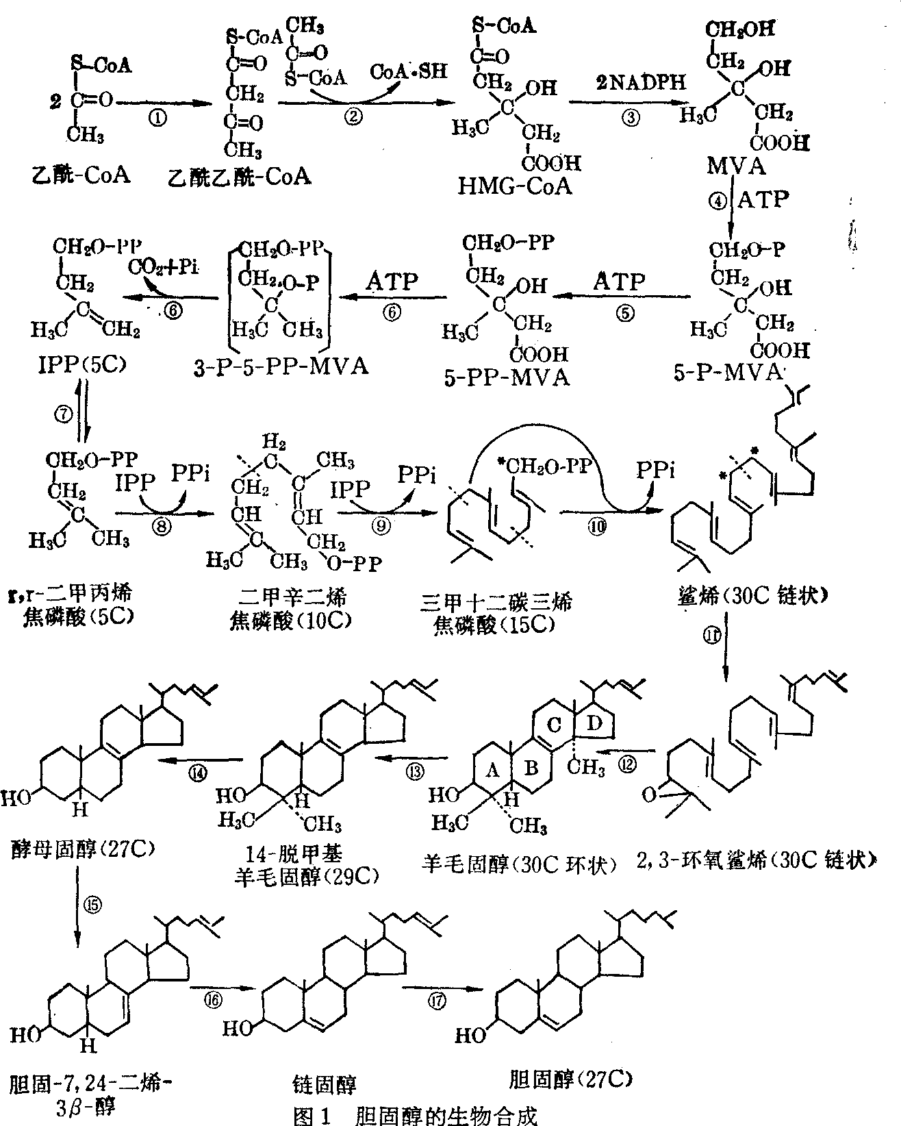 固醇的生物合成 动植物均能合成类固醇,昆虫及原核生物则不能合成固醇核,昆虫的重要激素一一蜕皮(激)素是以外源性固醇作原料合成的。大多数动物性类固醇也由胆固醇转化而来。胆固醇在体内除参与塑造组织细胞外,还有转变成胆汁酸、类固醇激素及维生素D3等重要功能。体内的胆固醇主要是重新合成的 (每日约Ig),每日仅有约0.3g胆固醇来自膳食中,如肉类、肝、脑、蛋黄等。肝脏、小肠、肾上腺皮质、皮肤、骨髓、睾丸及动脉等组织均能合成胆固醇,但合成的速度和量各不相同,肝脏和小肠是人体内胆固醇合成最活跃的器官,血浆胆固醇约10~60%来自肝脏,其余主要来自小肠。脑组织在生长发育期合成胆固醇功能旺盛,成年后合成极少; 网织红细胞可合成极少量胆固醇,成熟红细胞则不能合成,但可不断与血浆进行交换。 内源性胆固醇分子中的碳原子全部来自乙酰辅酶A。胆固醇的合成是在微粒体及胞液中进行,其过程包含: ❶由3分子乙酰辅酶A缩合成甲羟戊酸(MVA),后者经磷酸化和脱羧转变成活性五碳化合物异戊烯焦磷酸(IPP);这一化合物可与γ,γ-二甲丙烯焦磷酸互相转变。 ❷由6分子活性五碳化合物 (4分子异戊烯及2分子二甲丙烯) 缩合成鲨烯。 ❸鲨烯氧化环缩合成羊毛固醇,后者经多数步骤,包括丢失三个甲基而生成胆固醇。自鲨烯生成后,直至胆固醇的形成,作用物均属高级烃类,疏水性极强,因而必须有胞液因子“类固醇载体蛋白”(SCP)的参与,二者结合后,水溶性增加,才能从一个酶移向另一个酶,使酶促反应得以进行。由羊毛固醇转化成胆固醇的过程极为复杂,其中有很多酶是嵌在内质网膜上的。胆固醇生物合成及有关酶系分布见图1及表2。
