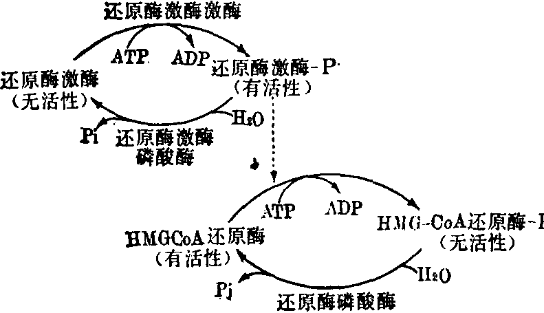 胆固醇生物合成过程中,HMG-CoA还原酶是一个限速酶,其分子量约为208000,代谢率很高,半寿期2~4小时。此酶在胆固酶生物合成的调控中,处于很重要的地位。多种调节胆固醇生物合成的因素,主要是直接或间接影响这一限速酶的活性而发挥作用的。重要的调节因素有: ❶胆固醇自身的反馈阻遏作用:肝细胞中胆固醇浓度的增高,即可抑制胆固醇的合成。其作用一方面是阻遏HMG-CoA还原酶的合成;另一方面可能是胆固醇与SCP结合后,可直接抑制HMG-CoA还原酶的活性,从而更迅速地调节胆固醇的合成。低密度脂蛋白(LDL)也有阻遏HMG-CoA还原酶的作用,这是由于LDL进入细胞后,在溶酶体酶的作用下,其中含量较多的胆固醇及其酯均以胆固醇的形式释放之故。由于胆固醇的这种反馈阻遏作用,食物胆固醇含量一般不致过多地影响血浆胆固醇浓度。但这一调节机构似乎只限于肝脏及骨髓,而对肠粘膜细胞无控制作用,因此,大量摄入胆固醇后,血浆胆固醇浓度仍有一定程度升高。此外也有报告提示,胆固醇反馈抑制的第二个环节是在鲨烯环化为羊毛固醇的步骤。 ❷总热量及膳食种类的影响: 肝内HMG-CoA还原酶的活性与摄入的总热量成正比关系,与活动量呈反比关系。饥饿时肝内的HMG-CoA还原酶活性及胆固醇合成速率明显下降,饭后此酶活性及胆固醇合成率则上升。糖、脂肪和蛋白质分解产生的乙酰辅酶A如有过量时,除可供合成脂肪外,亦可在微粒体大量合成HMG-CoA,使HMG-CoA还原酶所催化的反应亦随之加快。此外,HMG-CoA还原酶的辅酶NADPH主要来自磷酸戊糖代谢,而糖类食物能促进戊糖通路的运行。摄入过多的脂肪或脂肪动员增加时,不仅乙酰辅酶A来源增加,而且游离脂肪酸又是HMG-CoA还原酶的诱导剂,因此它能促进胆固醇的合成。不饱和脂肪酸的作用则相反,它既可降低血浆游离脂肪酸的含量,又能抑制肝内HMG-CoA还原酶的活性,从而使肝内胆固醇合成及血浆胆固醇浓度下降。这可能是由于不饱和脂肪酸可在体内转变成前列腺素,后者可通过cAMP蛋白激酶系统而使HMG-CoA还原酶失活,或抑制脂肪动员,降低血浆游离脂肪酸从而使肝中胆固醇合成减少。由此可见,适当节制饮食,增加体力活动,对于调节体内胆固醇合成,控制血浆胆固醇浓度有着积极的意义。 ❸激素的调节作用: 动物切除垂体后,肝中HMG-CoA还原酶和胆固醇的合成均见降低,给予生长素或ACTH后,血浆脂肪酸浓度和肝内胆固醇的合成速度均上升,并且血浆生长素水平的昼夜变化和HMG-CoA还原酶的变异在时间上比较一致。但胆固醇合成的昼夜变化是否和生长素的节律性分泌有关,尚待证明。肾上腺素和去甲肾上腺素可促进HMG-CoA还原酶的合成,从而增加胆固醇的合成。此作用是否和加速脂肪动员而增加血浆游离脂肪酸有关,尚未证实。甲状腺激素可使HMG-CoA还原酶及胆固醇的合成明显加速,但甲状腺功能减退者,给三碘甲腺原氨酸后,需在36h后才见HMG-CoA还原酶活性上升,故此激素恐非直接影响此酶活性,而可能是增加组织对儿茶酚胺的敏感性的结果。另一方面,甲状腺激素促进胆固醇转化为胆汁酸的作用比促进胆固醇合成的作用更强,因而甲亢病人常见血浆胆固醇降低,而甲状腺功能减退者,血浆胆固醇增高。肾上腺皮质激素、胰岛素和胰高糖素对胆固醇合成均有影响,但其作用均尚无定论。最近有人认为激素主要通过腺苷酸环化酶改变cAMP蛋白激酶系统活性,控制两型HMG-CoA还原酶的互变(图2)。