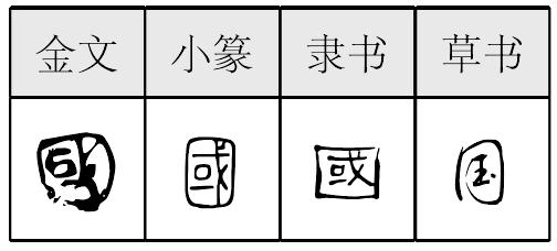 ɡuó國,表意,从囗从或,囗象征疆域,或指国家,本义表示国家,引申为代表国家的、属于本国的、国内最突出的等。南北朝时期俗字、《简化字表》简作“国”,把囗中的或改为玉。 【辨析】 ❶以“国”作音符构成的形声字一般声母为ɡ,但韵母不同。ɡuó:帼∣ɡuō:蝈∣ɡuāi掴。 ❷“国(國)”可作类推简化偏旁使用,如:掴(摑)、帼(幗)、蝈(蟈)。 ❸国/邦 见10页“邦”。 ❹国/都/邑 见499页“邑”。国 國; 甲 金 篆 隶guó【析形】会意字。甲骨文字形从口、从戈,即或,口表示疆域,会以戈卫疆之意。小篆字形后加“囗”,即國,或兼表音。 【释义】《说文》:“邦也。”本义指诸侯的邦国。又指古代王、侯的封地。后来意义扩大指国家。[国计民生]国家经济和人民生活。 【shape analysis】It is the associative character.In Oracle the first meaningful part is 口(kǒu)and the other is戈(gē).The 口means the states while戈(gē,warriors)means defending.In Small Seal script it was added囗that means a country.囗is also the phonetic component. 【original meaning】The country. |