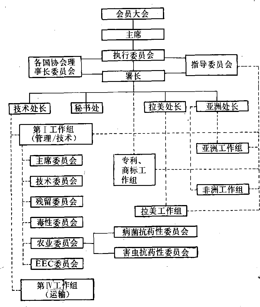 国际农药工业协会组织机构图 的一名代表组成。大会的主席、副主席和执行委员会的成员由会员大会的成员中选出。其下设机构如图所示。各委员会和工作组的职能如下:❶农业委员会。负责化学及生物农药的生物活性、作物生态、生态副作用、害虫防治及应用技术等问题,下设害虫抗药性和病菌抗药性两个委员会(简称IRAC和FRAC),最近又增设了杂草抗药性委员HRAC;❷残留委员会。负责化学农药的残留,及其管理与评价; ❸技术委员会。负责化学和生物农药的理化性质,及其质量标准; ❹毒性委员会。负责农药登记所需毒性试验及化学和生物农药的毒性事宜; ❺ EEC委员会。与欧洲共同体联系; ❻第I工作组。处理有关农药生产、分析方法、应用、毒性、残留等问题; ❼第IV工作组。负责铁路、公路、海空运输等问题。各地区工作组则处理相应的地区问题。 GIFAP出版多种出版物,如《GIFAP公报》(GIFAP Bulletin); 《现代农业中的植物保护》(PlantProtection in Modern Agriculture);《农药安全和有效使用指南》(Guidelines for the Safe and EffectiveUse of Pesticides);《农药安全运输指南》(Guidelinesfor the Safe Transport of Pesticides)等。这些出版物,一般有英文、法文、西班牙文和阿拉伯文四种文字的版本。 |