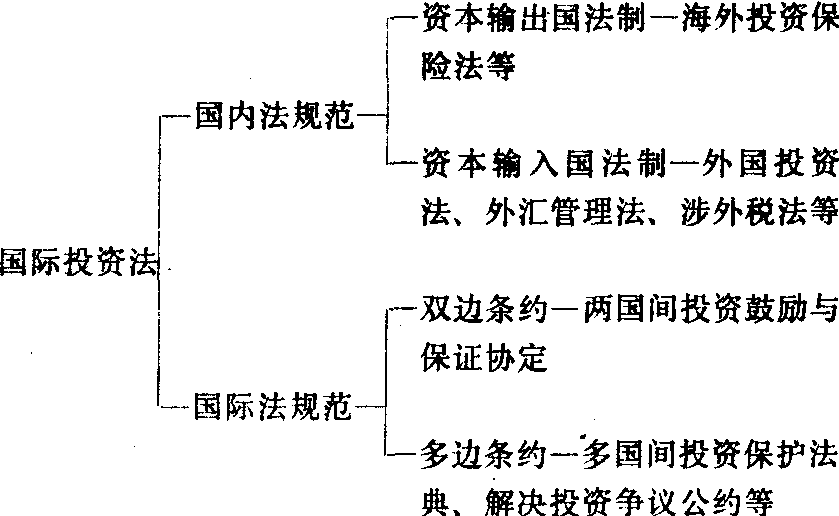 国际投资法的体系 国际私人投资关系具有跨越国境的私人资本流动的特点,上述国际投资法的这一特点,正是反映这一跨国活动的复杂性。它既有国内法上的关系,也有国际法上的关系,即包括国内法规范(如资本输入国的外资法,外汇管理法、涉外税法、资本输出国的海外投资保险法等),也包括国际法规范(如双边投资保证协定,解决投资争议公约等),两者相互补充,并籍此完成其效果(如美国的海外投资保证制度的适用,即以双边投资保证协定为前提)。所以,国际投资法是包括国内法规范与国际法规范而综合形成的一个独立的法律体系。列表如下: