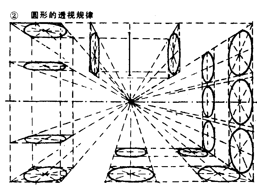 直立图形:正看是正圆形,向远处移动则近大远小,仍是正圆形。侧看是椭圆形,从正侧面看是一条垂直线。与画面不平行的圆形,其圆心与视平线等高时,是呈垂直的椭圆形;不等高时则为倾斜的椭圆形。平置圆形:都呈椭圆形。圆心正对心点时是水平的椭圆形,在两旁的圆形都是倾斜的椭圆形。当圆形与眼睛等高时成一条水平线,在视平线以上可见其底,在视平线以下可见顶面。离开视平线愈远,椭圆形短轴逐渐增长,弧度也逐渐增大。向深远移动的圆形逐渐缩小(见图3❷)。