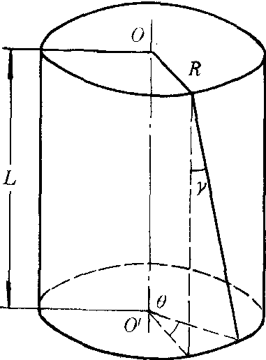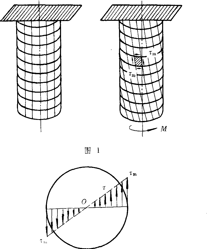 | 释义 | 圆柱体的扭转形变 圆柱体的扭转形变yuanzhuti de niuzhuan xingbian在与圆柱体轴线垂直的两端面上,分别作用方向相反的力偶时,圆柱体发生的形变。其内的基本形变是切应变。图1的左图为没有扭转形变竖直放置的圆柱体。设想在圆柱面上画有许多母线和水平圆周组成矩形格子。右图为圆柱体发生扭转时的情形,母线倾斜了同一角度r,圆柱表面上的矩形格子都歪斜成相似的平行四边形。这种现象表明,圆柱体表面的薄圆筒发生了切应变,圆筒横截面上下之间产生剪切应力。如果把柱体看成由许多个不同半径的薄圆筒围绕同一轴线套合而成,那么,扭转时,每一个薄圆筒都发生了切应变,只是越靠中心轴的薄圆筒,其母线的倾斜角越小,切应变也就越小,切应力也小,同一半径的薄圆筒上各水平剪切应力的大小及应变大小相同,其分布如图2。由于外层圆筒切应力大,抵抗扭转形变的作用大,因此,抵抗形变的任务主要由外层材料来承担。内层圆筒切应力小,靠近中心轴线的材料几乎不起作用,所以,需承受扭转形变的构件,可以用空心柱体以节约材料,减轻重量,而基本不影响构件抵抗扭转的能力。