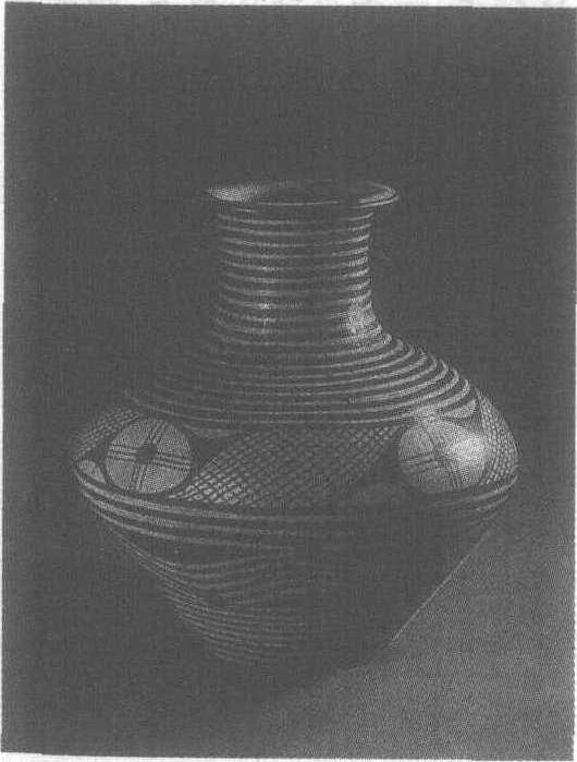 新石器时代马家窑文化马家窑类型。高28.5厘米,口径13厘米。1978年青海省民和县出土。口沿卷唇外撇,直颈,溜肩,腹中部以下内收。器身为橙黄色,表面打磨光滑极为细腻。通身用与橙黄产生强烈对比的墨彩饰纹。口沿为三撇叶纹。颈、肩以等粗的线条绘平行环带纹。肩部以下为主体纹饰。四组圈纹内饰三线十字纹。圈纹与菱纹构成的平行四边形相间的二方连续图案,此两种纹饰的空隙处成为弧线三角形。器腹下部除饰弦纹外,为避免呆板之嫌饰一圈加黑点的水波纹。此器花纹繁缛,笔触大胆泼辣,流畅有力,与器物浑然一体,表现了制陶人高超的艺术水平。马家窑文化见“束腰彩陶罐”条目。