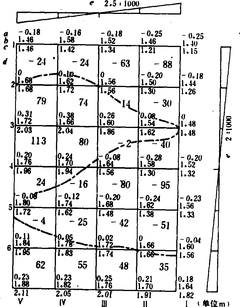 图1 平整单元测量方格图 a.挖填高(m);b.设计高程(m);c.实际高程(m);d.方格内挖填土方量(m3); e.坡降比;点划线:挖填分界线 施工方法 机械化土地平整一般分两步进行,即粗平和细平。若原地表起伏不大,可结合耕耙直接进行细平。 粗平作业时,按施工图中土方调配路线的方向划出宽7~10米的长条小区(图2中的虚线),插上标杆,机械在一个条区或相隔1~2个条区内作业。第一道工序是清表土,其深度为20~30厘米,用铲抛机清表土时沿条区长条方向绕圈,分层把表土抛到相邻条区内;用推土机清表土时,沿条区的垂直方向或斜向依次推到邻区,一次推深15厘米左右。第二道工序是平底土。高差悬殊时用推土机铲推,常用挖槽推土法,当用铲运机(运距超过50米)时,依次将挖方处的土铲运到填方处;当高差不悬殊时,可用平地机平整。底土平整土方量较大,要合理选择行车路线,尽量减少空行程,提高效率。底土平整后的地表高程应比设计高程低20~30厘米(清表土层深度)。第三道工序是松底土。即用松土机或犁将挖方处的底土进行松土或耕翻,其深度为20~30厘米。第四道工序是回表土。即把清到邻区的表土用铲抛机或平地机(斜铲作业)填回均摊。这样,完成一个条区的粗平后,用同样的方法依次完成整个单元的粗平。在平整单元内的小条区多呈平行状态时,可将清、回表土结合成一道工序,即先平好第一个条区后,把下一个条区的表土全部清到已平条区作为回填表土,这样工效更高。若熟土层厚而且地表高差不悬殊,则粗平时不必单独处理表土,可直接平整。细平作业,一般用牵引式平地机进行,先按整个平整单元的对角线方向交叉平整两遍,最后顺长边方向平1~2遍达到平整要求。作业时将平地铲刀刃调整到拖拉机与平地机后轮的支持面内不动,靠其较长的跨度有效地进行平整。无底铲斗式长型平地机细平效果更好(见农用平地机)。每个行程工作幅宽应有15~20厘米的重叠。 旱地改水田或小块水田合并成大块水田的平整,粗平在旱地或水田排水后进行,方法与旱田平整相同;细平在灌水后用水耙或耖田的方法平整。