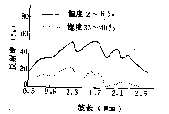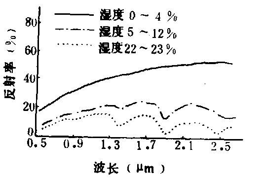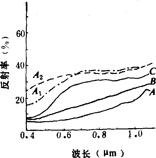 (b) 砂质土壤 图1 土壤水分变化与光谱反射率 土壤光谱反射率随有机物含量的增大而减小。有机物对土壤光谱反射率表现在0.55~1.0微米谱段范围内。图2中的A、B、C三条曲线分别代表了有机物含量不等的三种土壤光谱反射率曲线。曲线A1是有机物含量最高的土壤(即曲线A)脱去有机物以后的光谱反射曲线。从0.55微米开始,反射率明显增大。土壤中铁化合物的含量对光谱反射率的影响主要表现在0.40~0.54微米谱段范围内。铁化合物降低了土壤的光谱反射率。图2中的曲线A2是曲线A脱铁处理后的光谱反射曲线,0.40~0.54微米的反射率明显增大。
