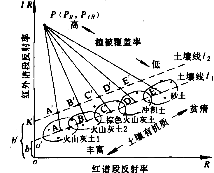 图4 土壤线 土壤线 土壤红谱段与近红外谱段的光谱反射率的比值,对不同的土壤种类、土壤中有机物含量和水分含量几乎为一定值。将各种不同类型、不同条件土壤红谱段反射率与红外谱段反射率组成二维空间的坐标散点图(图4),两者之间存在线性关系,其直线称之为土壤线。图中l1是完全裸露土壤的土壤线,其方程为: IR=aR+b (1) 式中 IR、R分别为裸露土壤红外谱段和红谱段的反射率,a为斜率,b为截距。l2为有一些植被覆盖的土壤线,方程式为: IR=aR+b′ (2) 式中 IR、R分别为土壤与植被混合的红外谱段和红谱的反射率。两条土壤线的斜率相等,截距之差称为植物生物量指数,用K表示:K=b′-b (3) 当植被覆盖不断增加时,则红外谱段的反射率上升,而红谱段的反射率下降,土壤线逐渐向上平移。利用(3)式可以求出不同时期的植物生物量指数。当土壤植被覆盖率达到100%时,则红外与红谱段的反射率集中于P点。垂直植被指数 将图4中的坐标进行平移和旋转,使0点与0′点重合,逆时针旋转α角度,使原横坐标与裸露土壤线l1重合并作为新坐标系的横坐标,新的纵坐标称为垂直植被指数。这样,原坐标系中土壤和植被混合的红外谱段反射率和红谱段反射率对应点(如图4中A′、B′、C′、D′、E′)在新坐标系中,就是排除了土壤反射光谱后纯植被的光谱反射值。消除土壤反射光谱干扰的垂直植被指数用于农作物生物量的估测,将大大提高估测精度。 土壤指数 日本福原道一、安田嘉纯等人将土壤指数(soil index)定义为: SI=〔PIR-MSS7〕/〔MSS5-PR〕(4) 式中 PIR、PR分别是植被覆盖率为100%时红外谱段和红谱段的光谱反射率,MSS7、MSS5分别为陆地卫星多谱段扫描仪中第7波段(0.80~1.10微米)、第5波段(0.62~0.70微米)的光谱亮度值。在干燥的条件下,测定的土壤指数与土壤中有机物含量有高度的相关性。土壤指数的变化可以显示出土壤有机质含量的等级。 土壤指数是随土壤含水量多少而变化的。由于有机质含量在短期内可以认为是一常数,采用多时相对同一地方不同干湿条件下求出不同的土壤指数,表示了该地方土壤含水量的信息。 由于地面总是被植被或其他地物所覆盖,完全裸露的土壤是很少的,利用遥感技术进行土壤分类、土壤有机质含量的测定、土壤含水量的测定等研究,需在了解土壤本身波谱特性的基础上,结合土壤背景综合的波谱信息进行分析、判别,并借助其他辅助手段(如土壤线、土壤指数、谱段组合等)才能获得所需要的研究结果。同时,在研究植被的生长情况时,也必须设法排除土壤反射光的干扰。 |