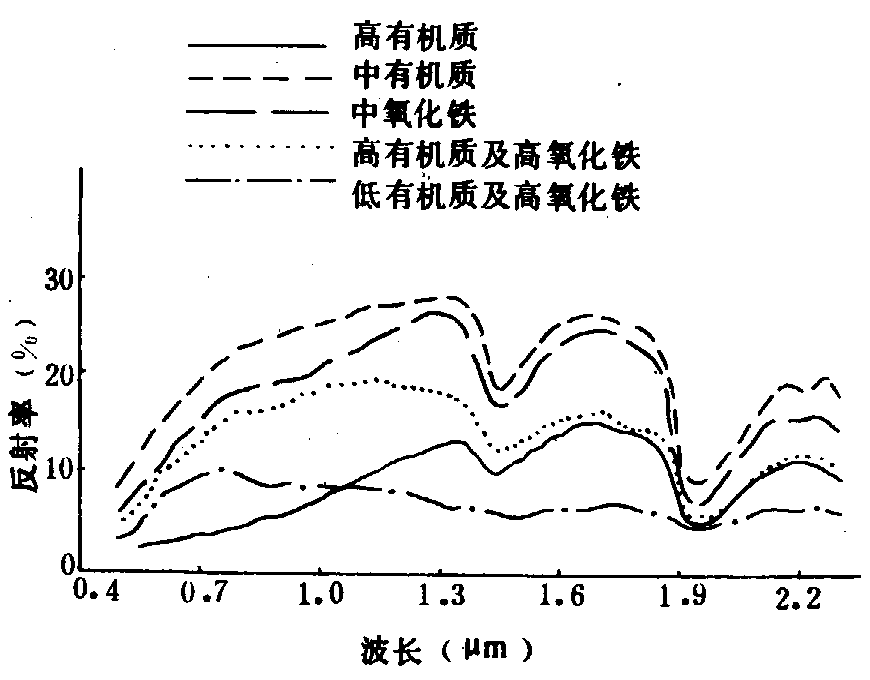 图2 有机物含量对土壤光谱反射率的影响 A.有机物含量为13.5%黑色火山性土(表土);B.有机物含量为7.19%褐色火山性土(表土);C.有机物含量为2.14%褐色火山性土(下层土);A1.A脱去有机物后的曲线;A2.A脱去铁后的曲线 土壤表面结构粗比表面结构细的光谱反射率低;风化程度对土壤的光谱反射率也有一定的影响。 康迪特(H.R.Condit)曾在0.32~1.0微米波长范围内测定了美国许多种土壤的光谱反射曲线,归纳起来分为三大类型。斯托纳(E.R.Stoner)和鲍姆加特纳(M.F.Baumgardner)(1980)在分析研究康迪特的土壤反射波谱三种类型之后,经过大量研究测定,根据土壤有机物和氧化铁的含量,将土壤反射波谱曲线分为5种基本类型(图3)。