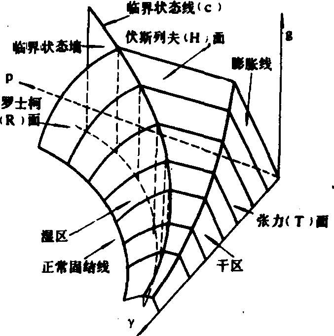 非饱和和饱和土的应力应变和失效状态比较完整地由以孔隙比ν和八面体法向应力(σ8)和八面体剪应力(τ8)为坐标轴的临界状态模型描述,如图2。当土体任一点应力状态到达(R)面时发生流动失效;到达(H)面时发生脆性破坏;到达临界状态线(C)时,土体单元的剪应力不再增加,单元只变形而容积不再变化。 在水田或沼泽土的情况下,往往呈现作用力定常而变形随时间而增大(蠕变)或变形保持定常而应力随时间而消减(松弛)这样的流变特性。当时间效应对所讨论的问题的受力与变形流动具有显著意义时,常将土壤作为含有应力与应变速率或应力、应变与时间之间关系的粘弹塑性体或某种流变体处理。图3为土壤蠕变过程一例。