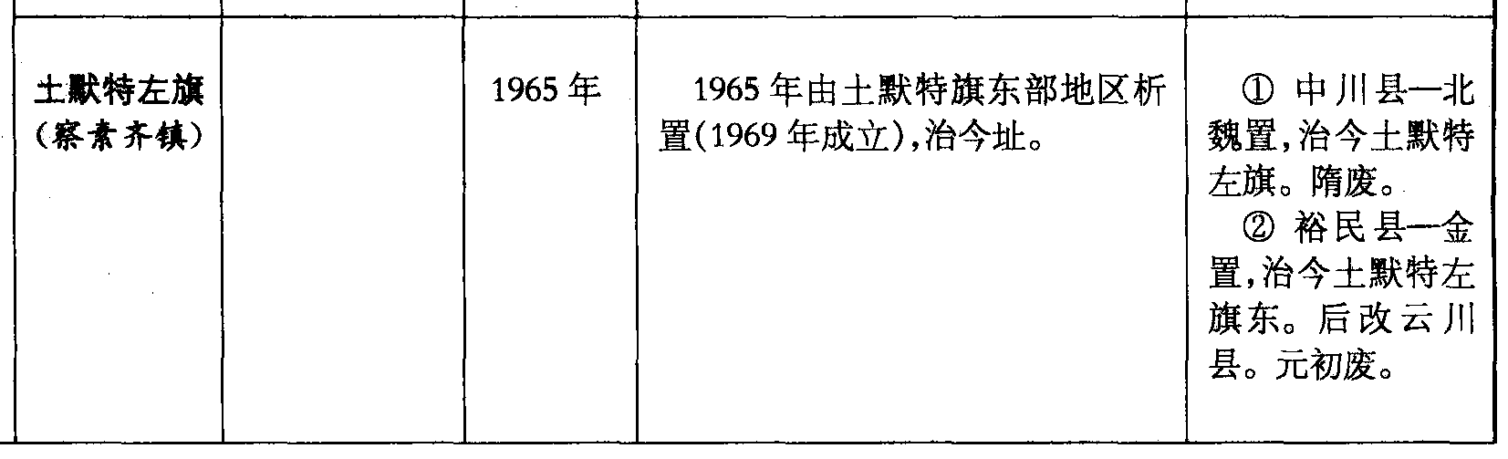土默特左旗(察素齐镇)1965年1965年由土默特旗东部地区析置(1969年成立),治今址。❶ 中川县—北魏置,治今土默特左旗。隋废。❷ 裕民县—金置,治今土默特左旗东。后改云川县。元初废。
