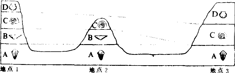 地层对比示意图 ☚ 地史学 古生物化石 ☛ 地层 地层diceng指一定层位的一层或一级岩石。地层可以是固结的岩石,也可以是没有固结的堆积物。它与上下相邻地层之间可以为明显的层面或沉积间断面所分开,也可以由岩生、所含化石、矿物成分、化学成分、物理性质等特征的变化所导致的不十分明显的界限所分开。地层一般指成层岩石和堆积物,包括沉积岩、火山岩和由沉积岩以及火山岩变质而成的变质岩。在不同的地层中常有由不同的生物遗体所形成的化石,如石炭纪、二叠纪地层中则有大量蕨类植物化石,白垩纪地层中才出现大量的被子植物化石等。 ☚ 植物进化历程 沉积岩 ☛ 地层 地层Diceng地壳上部各种成层岩石的总称。主要是沉积岩,但也包括火山成因的和变质岩的成层岩石在内。地层具有特定的地质时代的涵义,因为它是在一定地质时代形成的,每一层每一组都有它自己的形成时代和年龄。而岩层则往往是泛指各种成层的岩石,例如砂岩层、灰岩层,不强调时代的概念。不过,在实际应用时两者也可以互相代替,并不严格区分。如果地层未受到扰动,未发生逆转,它应该是下老上新,这种地层顺序叫正常层位,这种上新下老的关系叫地层层序律。研究地层,划分其新老顺序、等级系列、确定时代,叫地层划分。划分地层必须有一定的根据,一是岩性根据,如砾岩层、砂岩层、灰岩层等;二是生物化石根据,不同时代的地层常含有不同种类的化石或化石石群;三是沉积旋回根据,例如从海侵到海退,沉积岩层(从下而上)应是由粗到细(如从砾岩、砂岩、页岩到灰岩等),又由细到粗(如从灰岩、页岩、砂岩到砾岩等)的有韵律的变化,这种变化称为一个沉积旋回。沉积旋回可以反映海陆变迁及地理环境的变化;四是地层接触关系,如整合、不整合等,它们可以反映在沉积过程中地壳的升降运动或褶皱变动;五是根据地层的同位素年龄,特别是对那些缺少化石的古老地层更为重要。对不同地区的地层进行层位和时代的比较,称为地层对比。通过地层对比可以认识更大范围的区域地层特征。地层对比首先是地质时代或层位的对比,对比的主要根据是生物化石,如图中三个地点的地层中凡含有相同化石的,就用点线连接起来,表示它们的层位(A.B.C.D)或时代是相同的。地点3缺失B层,可能因地壳抬升没有沉积,也可能有沉积而被剥蚀掉了。不含化石的地层一般称为“哑地层”,在这种情况下就不能用古生物方法进行对比,而利用岩性、沉积旋回、岩层接触关系、同位素年龄等进行对比。近年来对微体古生物化石和孢子花粉的研究日益深入,有些所谓哑地层就不“哑”了,可以利用它们作为划分对比地层的重要根据。