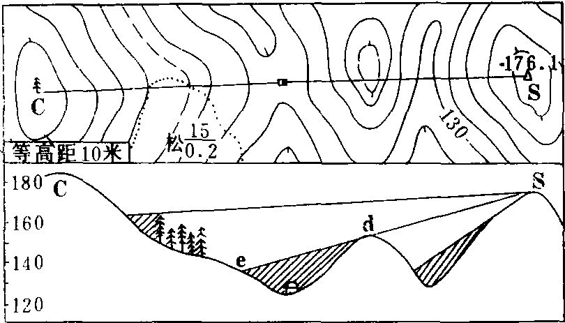 ❸在图纸上或方格纸上绘一条水平线,如图1MN,在地形图上沿剖面线AB量Ac,cd,de……各段的距离,按剖面图的水平比例尺将量出的各段距离转到MN线上,得A′、c′、d′、e′……B′各点,通过各点作垂线,垂线长度是按各点高程依垂直比例尺计算出来的,将垂线各端点连成平滑曲线,注出水平比例尺、垂直比例尺和剖面线的方向,即成剖面图。剖面图还可以帮助我们了解野外考察时观测点的通视情况。如图2所示,由观察点S向目标点C(如树)绘直线,直线没有被任何地物所切断,表示通视良好,否则就不能通视。如剖面图上的房屋是不能通视的点,因Se直线被山头d所切断。图2上绘有晕线的部分,是不能通视的地区。