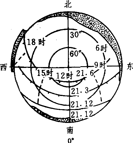 | 释义 | 地形遮蔽图chart of topographical obstruction又称地平遮蔽图或天空遮蔽(角)图。在小气候或山地气候研究中,为了确定测点周围遮蔽物对测点资料的影响而绘制的地形地物遮蔽角(仰角)一方位角图。绘图时以测点为圆心,画等角距同心圆和放射状直线。同心圆距圆边的角距离表示对测点地平面的遮蔽角。以圆心为90°,依次向外每隔10°标出仰角的数值,直至最外的圆周表示仰角为0°(地平遮蔽角为零)。放射线表示方位角,以正南为0°,逆时针方向每隔10°标出方位角的度数,正东为-90°,正北为-180°等;从正南顺时针方向到+90°为正西,+180°为正北。测点四周每一地形地物的遮蔽角和方位角,都可用经纬仪或罗盘仪进行测定。每隔10°或5°测量一个目标物,并依次记下相应一对数字(目标物的遮蔽角和方位角)和目标物种类与名称。然后将各对数字按顺序点绘在上述极坐标图上,并连结成一条闭合折线,即成为地形遮蔽图。若在该图上画出小气候观测期间的太阳轨迹线,就可了解不同方位的地形地物对太阳辐射、日出与日没时间和其他气象要素的影响。