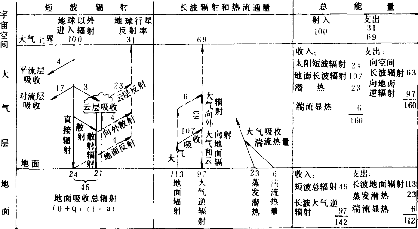 地球热量平衡 图的左侧实线表明大气和地面获得的能量,右侧实线是对流层大气获得的能量。假定进入大气上界参加交换的射入辐射为100单位 (相当于182.8×106瓦或263千卡/厘米2·年)。 ☚ 大气辐射 热量输送 ☛ |