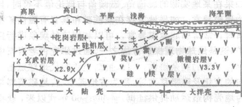 地球内部圈层构造示意图 地壳:位于莫霍面以上部分称为地壳。地壳表层岩石平均密度2.65克/厘米3,处在常温、常压下。地壳底部密度增加到2.9克/厘米3,温度高达1 000℃左右,压力可达1万个大气压。地壳的总体积只占整个地球体积的1%;其质量仅占地球总质量的0.8%。地壳又可分为大陆型和海洋型,大陆型地壳厚度大,平均厚约33公里,高山地区厚度更大,我国西藏及天山地区可达70公里厚。大洋型地壳厚度小,平均只有7.3公里。按组成岩石类型地壳又可分为上下两层,上层主要由花岗岩和沉积岩组成,称为花岗岩层。此层在山区厚度可达40公里,在平原区平均厚为10公里左右,在大洋底则很薄,甚至缺失。下层主要由玄武岩组成,称玄武岩层,在陆上较厚,可达30公里,在深海底仅为5—8公里厚。因为这两层的化学成分都是以硅铝为主,又称为硅铝层。地壳之下为橄榄岩层,密度较大,属上地幔,因其铁镁含量较高,又称硅镁层。