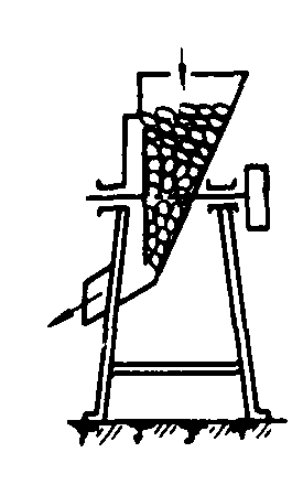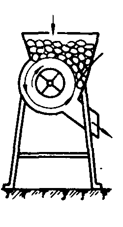 图1 块根切片机 垂直圆盘式块根切片机[图1(a)],在垂直圆盘上开有2~4个径向孔口,刀片安装在孔口旁,刃口伸入喂入斗内。圆盘转动时,将喂入斗内的块根切下,碎片穿过圆盘上的孔口,从圆盘的另一面排出。该机工作可靠,结构简单,使用保养方便,但刀片利用系数(圆盘每转刀片实际切割面积与所扫过的总面积之比)较小。 水平圆盘式块根切片机[图1 (b)],有一个装有2~4把刀片的水平圆盘。喂入斗位于刀盘正上方,圆盘转动时,刀片将喂入斗内的块根切成片,从圆盘上的孔口漏下。喂入斗内装有两块倾斜挡板,用来压紧块根,防止随圆盘转动,以便于切割。该机工作可靠,刀片利用系数较大,生产率高,可切块根和体积较大的瓜类饲料,但结构较垂直圆盘式复杂。 锥形滚筒式块根切片机[图1(c)],在锥形滚筒表面沿其母线配置3~4把刀片,喂入斗位于滚筒上方。滚筒转动时将喂入斗内的块根切成片,穿过滚筒上的孔口漏入滚筒内部,沿锥筒内表面卸出。切割时块根靠自重压在滚筒上,容易跳动,影响生产率,刀片利用系数也小,使用较少。 刀片是切片机的主要工作部件,其形状及刃口安装高度决定切片的形状和厚度,可根据饲喂对象的要求加以选择。常用的刀片有直线刃口、梳状刃口、铲形刃口和创丝刀片四种。直线刃口刀片将块根切成很宽的薄片,其厚度等于刃口伸出圆盘面的高度,薄片的长、宽由块根形状决定。适于饲喂成年牛。梳状刃口刀片的刃口呈梳齿状,切出的块根碎片呈窄条状,适于饲喂犊牛和猪。铲形刀片的刃口呈波浪形,切片呈半椭圆的窄条。切片质量较好,没有撕裂现象,但刃口制造、磨锐较麻烦。刨丝刀片是在一般的直线刃口刀片上固定一排垂直于该刀片的直立短切刀,能切出窄条状的细丝,适于饲喂幼猪和犊牛。 块根洗涤切片机 常用的有滚筒式和离心式两种。滚筒式块根洗涤切片机,在栅条状洗涤滚筒出口处衔接一个垂直圆盘式切片机。其洗涤原理与滚筒式洗涤机相同,但没有水,适于清洗表层较干、泥沙较易脱落的块根。洗涤后由勺铲舀入切片机切成片状。 离心式块根洗涤切片机(图2)有内、外两个圆筒,外圆筒上方安装喷水器,用来冲洗块根,内筒壁上安装2~3把固定刀片。中央传动轴上固定有内、外翼片和大、小洗涤盘。内翼片位于内筒里侧,外翼片位于内、外筒之间。当小洗涤盘落在大洗涤盘上时,只能洗涤块根,这时块根受到喷水器的冲淋,并在离心力作用下被抛向外简壁,从出口排出。当小洗涤盘升起时,可同时进行洗涤和切片。经喷水器冲洗过的块根进入内筒后,随内翼片旋转,在离心力作用下被抛向内筒壁,被筒壁上的固定刀片切成薄片,穿过内筒壁由外翼片排出。此机生产率高,切割质量好,刀片利用系数高,但结构复杂,成本较高。