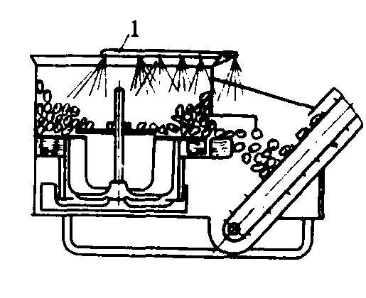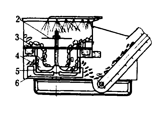 图2 离心式块根洗涤切片机 1.喷水器;2.小洗涤盘; 3.大洗涤盘;4.内翼片;5.固定刀片;6. 外翼片 块根洗涤切碎机 常用的是螺旋式。它由大容量的水箱、倾斜螺旋升运器、切碎器及水泵组成。块根倒入水箱后,由螺旋升运器向上推送,经切碎器切碎后排出。在向上推送过程中,块根受到水流从上往下的冲击,以及块根相互之间、块根与叶片、筒壁之间的相互摩擦,将块根表面泥土洗去。沉积在箱底的泥沙由排泥口定期排出。切碎器位于螺旋升运器出口处的下方,它由一组圆盘刀片(每个圆盘上固定有几个刀片)组成。洗净后的块根经旋转的切碎器切碎后排出。 |