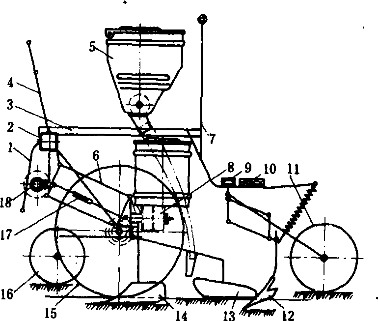 垄作播种机示意图 1. 下悬挂臂; 2. 主梁; 3. 纵梁; 4. 上悬挂臂;5. 排肥装置; 6. 仿形机构; 7. 扶手; 8. 排种装置;9. 后梁; 10. 脚踏板; 11. 镇压轮; 12. 起垄铲;13. 覆土器; 14. 开沟器; 15. 地轮; 16. 仿形轮;17. 万向节轴; 18. 中间传动轴 垄作播种机seeder for ridging适于垄作地区进行垄上播种的机具。在中国东北以垄作为主,要求所用播种机应能垄播也能平播起垄,更换部件还能中耕。主要由机架、地轮机构、排种器、开沟器、覆土器、镇压轮和仿形机构等组成。采用单体结构和垄上通用梁式机架加上仿形机构,有利于调整行距和保持各行播种深度的一致;采用型孔轮式排种器,降低了投种高度,提高了成穴性能;采用三角犁铧和芯铧式开沟器,能保证形成一定的垄形,并具有开沟宽、沟底平、播前除草灭茬和以湿土盖种等优点,能满足垄上开沟和平播开沟种植大豆、高粱、玉米、谷子四大作物的要求。 |