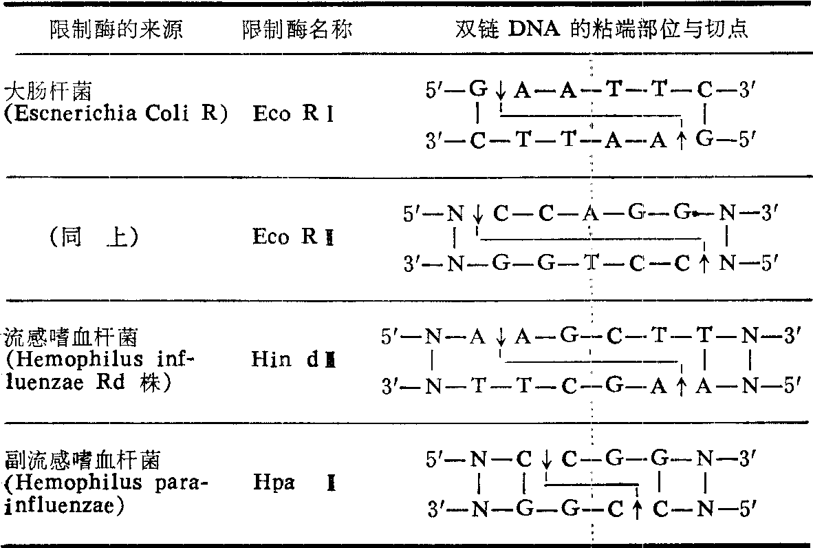 酶系的选用 基因工程涉及整个核酸酶系,主要有限制性核酸内切酶、末端转移酶和核酸连接酶。 (1) 限制性核酸内切酶: 简称限制酶,广泛地分布在很多微生物内,是各种细菌破坏异源DNA、保护自己DNA完整的武器。限制酶能把DNA大分子切断成若干小片,常用于分离目的基因和切开环状载体,为制备新的DNA组合创造条件。限制酶的特点首先是能识别DNA中的特殊顺序,该顺序由4~6个特定核苷酸组成,在双链DNA上排列成回纹式顺序; 其次是能在识别部位的旋转对称轴上或附近某点上把两个邻近核苷酸之间的连接切断,即通过水解把一个核苷酸脱氧戊糖中3′位碳同另一个核苷酸脱氧戊糖中5′位碳之间的磷酸二酯键切断,形成含5′-P和3′-OH的片段。按切断方式可分两类: 一种是交叉切断,即在两链上特定部位(即识别部位)的左侧(按由5′→3′的方向)切断各个单链,由此产生的识别部分各形成一个方向相反的互补碱基末端,这种末端叫做粘性末端,因为在一定条件下,两个粘性末端又可以互补粘合,恢复原形(表1)。另一种是在DNA分子的旋转对称轴上横切,在切口两侧形成两个钝端或称平端(表2)。 表1 限制酶的识别部位与切点