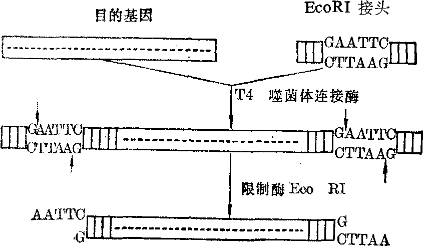 (4) 反向转录酶:见本条中“目的基 图1 末端转移酶作用与同聚尾形成 重组体的构建 DNA体外重组是将目的基因用DNA连接酶接在合适的载体DNA上,以便下一步转化之用。这样重新组合的DNA叫做重组DNA,简称重组体,因为是由两种不同来源的DNA组合而成,所以又称为异源嵌合DNA。连接方式主要有粘接法和平端连接法,后者包括平接法、接头法和均聚尾巴连接法。 (1) 粘接法: 用适当的限制酶分别降解含有目的基因的DNA及切开载体DNA,使它们的二端各具有相同的粘性末端,然后在适当温度下,两者的互补粘性末端通过氢键配对,再用DNA连接酶(共价)连接(图2)。此法优点是在克隆繁殖后经过同一限制酶降解,可以回收目的基因。缺点是载体自身两端也有互补粘性单链,粘合成环的机会很大,需在高浓度的外源DNA条件下或用单酯酶将载体上的5′P切去,使之不能自接,才能避免粘合。 (2) 平端连接法: 有些限制酶不产生粘性末端,机械剪切也产生平端,平端连接法大体有以下几种: ❶平接法: 载体和目的基因的平端,可用大量T4噬菌体DNA连接酶连接起来。 ❷接头法: 利用核酸化学合成技术,可以合成含有一种或多种常用限制酶识别顺序的双链DNA短片段,这类DNA短片段叫做接头。然后用DNA连接酶把接头连接到目的DNA的两端,再用该种限制酶将接头切成具有粘性末端的单链,便能同经过同一种限制酶作用的载体的粘性末端互补进行粘接。这种接头法适用于没有所需限制酶切点的目的基因,或者为避免破坏目的基因上没有切点的限制酶接头。这个方法的优点也是可以用同一限制酶回收目的基因。(图3)