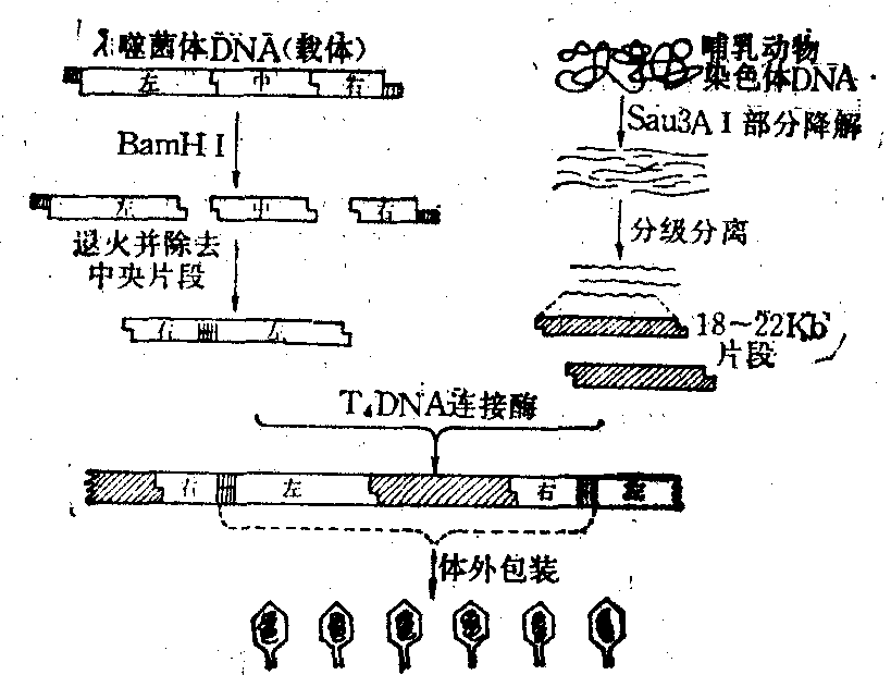 基因库构建示意图 3. DNA重组。切割的DNA片段大小会影响与载体DNA重组时的连接效率。若采用质粒DNA作载体时,小片段容易插入,而分子量大于10kb的片段则重组效率很低。如使用噬菌体替代型载体时,重组DNA体外包装噬菌体的效率与重组DNA分子大小有关。重组体DNA长度只有相当于野生型DNA长度(全长为48kb)的78~105%范围之内,才能有效地被包装成噬菌体,过长或过短的DNA链均不能被包装。因此插入片段必须有一定的大小,使之重组DNA的长度符合有效包装的限定长度。λDNA的长度则取决于λ载体上可被取代的那部分DNA的长度,例如目前应用比较多的是λEMBL3和L4的载体,插入片段可为14~20kb,最大不能超过22kb。而对于cosmid,其可容纳的片段大至45kb。总之,为了有效连接和有效包装或转化到细胞中,插入片段要进行分级,取得相对一致的大小以提高重组效率。 4. 大肠杆菌的克隆体系中,常用的载体有三类:质粒、λ噬菌体和Cosmid。而在构建基因库时,主要选用替代型的λ噬菌体载体,例如λEMBL3和λEMBL4、Charone4A、Charone 28等等。目前新发展的载体为Charone34、35。根据λ噬菌体基因组的结构特点,其线性分子两侧(常称为左、右两臂)的各基因是噬菌体存活所必需的,而中间一部分基因可被其他DNA替换,并不影响其噬菌体的生存。因此选用合适的限制性核酸内切酶位点可将λ噬菌体DNA两臂切割下来,而与外源性DNA片段重组连接,构成的重组体可用含噬菌体全部外壳蛋白的抽提液在体外包装成完整的噬菌体颗粒,以此感染大肠杆菌宿主细胞。重组噬菌体繁殖形成了噬菌斑。 选用λ噬菌体DNA作载体的优点是: 可接受较大分子量的外源性DNA片段(18~22kb);使插入片段可包含有完整的基因结构,而且噬菌体的体外包装效率高,一般每微克正常的λDNA可达到108pfu (噬斑形成单位)以上,重组体DNA也可达到5~10×105pfu;用λ噬菌体感染大肠杆菌的效率也高,形成的噬菌斑适合于采用分子杂交技术来筛选克隆。因此,选用替代型λ载体构建基因库较为常见。 Cosmid是一种含有λ噬菌体cos位点序列的人工构建的质粒。它分子量不大,可容纳更大的插入片段,最大片段可达45kb。重组的cosmid借助其λ噬菌体cos位点的序列结构而可在体外包装成噬菌体颗粒。此颗粒如同噬菌体一样具有感染大肠杆菌的能力,进入宿主细胞后,则按质粒DNA的方式进行复制。但是用cosmid作载体来构建基因库,其难度比λ噬菌体的载体大。因为提供插入片段的供体DNA分子必须足够大,否则重组效率太低;其次,用DNA杂交技术筛选cosmid克隆时,其效率(菌落杂交法)低于噬菌体的噬菌斑杂交法。至于质粒DNA虽然其可容纳的外源性基因大小受到限制,但由于质粒比较容易操作,因此它也是构建基因库常用的载体,特别是用富集某种特殊基因的部分基因库的构建。 不同来源基因组在被构建基因库时所需要的克隆数目的理论值