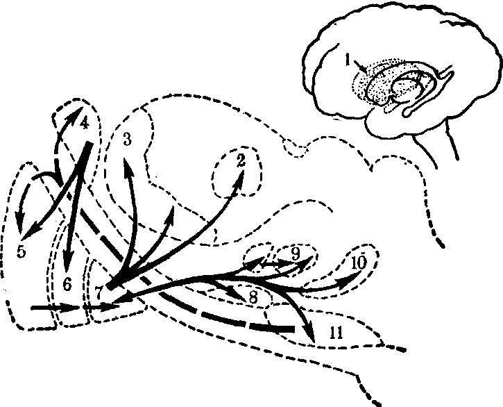 基底神经节及其神经联系(箭头表示功能性投射) 1. 基底神经节 2. 中央中核 3. 腹前核 4. 尾状核 5. 壳核 6. 苍白球外段 7. 苍白球内段 8.丘脑底核 9. 红核 10. 腹外侧被盖 11. 黑质 抑制肌紧张是基底神经节的主要功能之一。来自基底神经节的抑制性信息到达脑干网状结构易化区,其兴奋性信息则到达抑制区。若基底神经节广泛损伤,则网状结构易化区活动过多,抑制区活动过少,出现全身肌僵直。所以若在中脑水平切断脑干,去除基底神经节的抑制效应,是产生去大脑僵直的重要原因之一。除抑制作用外,刺激基底神经节有时发生肌肉收缩,甚至出现复杂的运动形式。纹状体可通过下列途径发动和调节身体较粗的意向性运动: ❶纹状体→苍白球→丘脑→皮质→脊髓; ❷纹状体→苍白球→黑质→网状结构→脊髓; 但是这种运动正常时是在意识支配下完成的,苍白球所起的主要作用是为意向性运动提供背景肌张力; 肌肉的这种紧张性收缩是由包括苍白球在内的神经回路发动的,若破坏苍白球,难于进行细致的技巧活动。当动物活动时,刺激苍白球或尾状核可使运动停止在某种静态位置上好几秒钟。可见,纹状体和苍白球包括在某种伺伏反馈(Servo-feedback)运动控制系统之中,能将身体各部位限制在一定位置上。这一环路极为重要,它为双手作精细活动时提供躯体和上肢的背景运动。损伤基底神经节后在不同动物表现不一。损伤猴双侧苍白球,出现运动减少,不能精确抓握,意向性运动有严重震颤; 猩猩的纹状体-苍白球联合损伤,出现四肢缓慢的虫样蠕动。在人体,基底神经节损伤导致一系列运动功能障碍。如纹状体损伤时,出现肌张力过低和运动过多(舞蹈病,手足徐动症);苍白球损伤时,出现运动过少和肌张力增高综合征 (帕金森综合征)。近年来一些实验说明尾状核还可能与感觉功能有关。尾状核可以对视、听、躯体、内脏等各种感觉刺激发生反应,例如刺激体表一定部位可在尾状核记录出诱发电位;刺激尾核还能提高动物的痛阈,因此认为尾状核与针刺镇痛有关。 ☚ 大脑边缘叶与边缘系统功能 正常脑电图 ☛ |