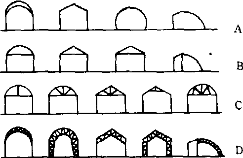 类型与结构 类型有屋脊式和拱圆曲线型。屋脊式是在玻璃温室的基础上改建而成的。这种结构通风透光良好、耐风雪性较强。其中有双斜面型,由两个屋面组成。这种温室开始是木结构,后来发展为钢结构。拱圆型包括各种曲率的圆弧曲线类型。曲线型或半圆型屋顶结构能提供最大限度的光透射量。拱圆型屋架受力较好,建筑费用比屋脊式便宜25%左右。但是拱圆型安装通风窗比较困难。中国的塑料温室大部采用拱圆型。此外还有一面坡塑料温室。一边为直立式,由砖或土夯实建成的墙,另一面有三折式或拱圆曲线形骨架。这种温室的保温性能较好。根据需要还设计了特种形式的温室。如蒙古包式的塑料温室,全圆型的屋顶,造型美观。有些国家创造了多种型式的结构:如充气结构的温室,覆盖物是一完全密封的双层塑料薄膜,处于充气状态,固定在结构的外部边缘上;泡粒塑料温室,用双层塑料薄膜,晚上温度下降时,在两层膜之间送入聚苯乙烯泡粒,用以提高保温性能,白天将泡粒排出; 空气塑料温室,不用支柱,或者仅在温室前后部分用些支柱,借助风机向室内吹入压力空气支持覆盖物。骨架型式:❶单梁式:单根线材做柱架,不做任何加强(图1A)。屋脊式多用木材或角钢,拱圆型多用竹木材料,钢管及塑料管。适合跨度小,高度较低的小型温室。投资少,光照好。 ❷横梁式:在屋脊式的人字架上或拱圆型的拱架上加一横梁,耐风雪性能增强(图1B)。 ❸拉梁式:在横梁式的横梁与顶间加一拉梁(图1C)。 ❹桁架式:大型温室可用型钢或管材构成各种不同形式的桁架结构(图1D),增强结构强度。