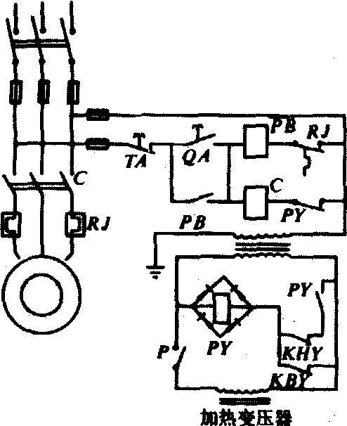塔式电泵站electric pump station with tower利用水塔标高所形成的压力,向管网供水的设施。该系统由水源、自动电泵站、供水管网、用水设备等组成。塔式电泵站校易于实现自动化,但对自动化元件的要求可靠、稳定、且具有瞬动性能,其基本元件是装在水塔储水箱内的水位传感器。水位传感器有浮子式及极板式两种,以极板式(图1)较为理想。所用电极板为250×250平方毫米的两块钢板,厚约2~3毫米,极板间距为10毫米,其中一块直接焊在钢管上,另一块固定在绝缘套管上。极板共两对,其间保持一定距离,分别与储水箱的上、下水位相对应。极板式水位传感器在储水箱中安装的尺寸如图2。在控制电路(图3)中KBY为上极板,KHY为下极板,当上、下极板全部露出水面时,电机水泵机组启动向水塔储水箱输水;当储水箱水满,极板全部浸没水中,电机停止,输水亦停止。在冬季为防止上极板的极板间隙被冰冻结,破坏自动工作,需加装一台加热变压器,以上极板间隙中的水为负载,闭合线路中的开关P,即开始加热融冰,冰融后工作恢复正常。