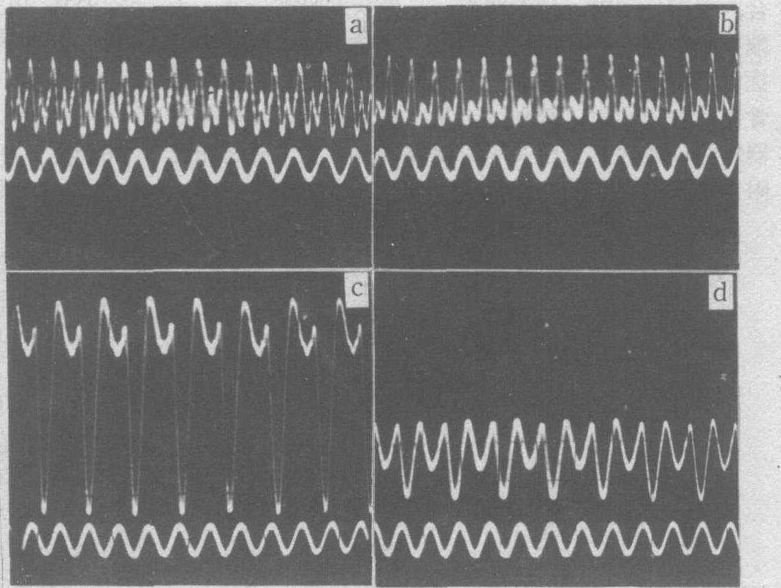 a-b,雄蚊飞翔声波形;c-d,雌蚊飞翔声波形 (各图下线是500赫正弦波)