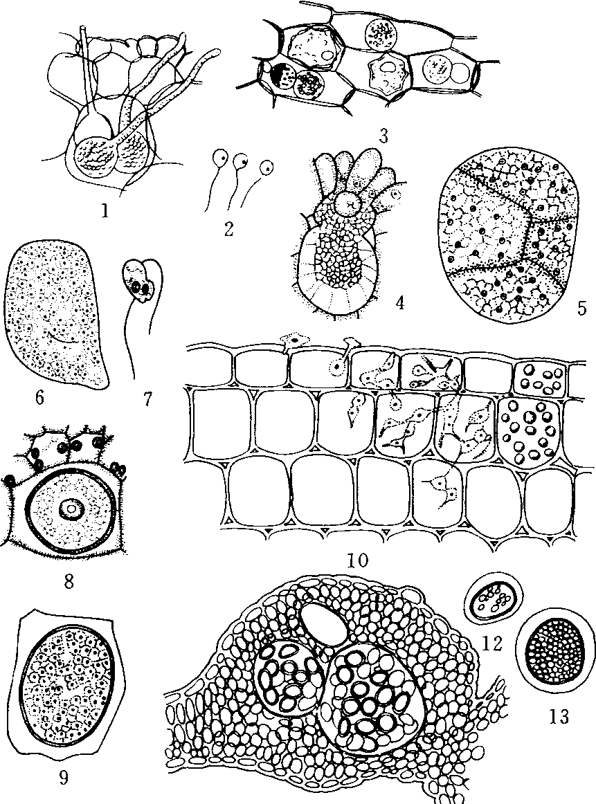 油壶菌属〔Olpidium (Braun) Rabenh〕 菌体整体产果式,生于寄主细胞内,形成孢子囊或休眠孢子。孢子囊球形至椭圆形,壁光滑,出管长短不等,顶端露出寄主细胞外。游动孢子内常有一油滴。休眠孢子壁厚,萌发释放游动孢子。至1983年已记载25种,分布广。有部分种可寄生高等植物引起病害。如芸薹油壶菌〔O.brassicae(Woron.)Dang.〕引起十字花科植物幼苗猝倒病及番茄、烟草、亚麻等根部病害,并可传播烟草坏死病毒等多种植物病毒; 三叶草油壶菌(O.trifolii Schrot)引致三叶草叶柄、茎的扭曲、肿大及叶瘤。 集壶菌属(Synchytrium de Bary et Woronin)营养体初期无细胞壁、无性繁殖形成有细胞壁的孢子囊堆; 游动孢子囊无色,产生游动孢子或游动配子;游动配子交配形成的双鞭毛合子侵入寄主,在体内形成休眠孢子囊; 休眠孢子囊球形至椭圆形,外壁厚,褐色,内壁薄、无色,萌发时形成孢子囊,囊壁破裂释放出游动孢子。侵入寄主表皮细胞,刺激寄主细胞增生。至1983年已记载121种,均为植物寄生菌。内生集壶菌〔S.endobioticum (Schulb.) Percival〕侵染马铃薯引起癌肿病,危害性大。 节壶菌属(Physoderma Wallr.) 营养体细胞多呈管状,有隔或无隔,外寄生阶段的假根少而粗短。无性繁殖产生外生游动孢子囊,聚集时成稀疏的褐粉状。内寄生的经配子交配产生休眠孢子,黄褐色近圆形,萌发时转变为有囊盖的孢子囊,释放出多个游动孢子。侵染维管植物,病斑略隆起,但不引起细胞过度增生。到1983年已记载50种,分布广。玉蜀黍节壶菌(P.maydis Miyabe)为害玉米叶片、叶鞘及茎,引起褐斑病。 尾囊壶菌属(Urophlyctit Schroter) 营养体为膨大细胞,具数根假根状菌丝。其顶端可反复生成膨大细胞,或形成顶生的厚壁休眠孢子囊。休眠孢子囊未成熟时在囊盖四周有分枝的吸器,萌发时开盖释放出游动孢子。已知13种,寄生于种子植物形成瘿瘤。《真菌字典》第7版将该属作为节壶菌属的同物异名处理。车轴草尾囊壶菌〔U. trifolii (Pass.) Magn.〕为害紫云英引起结瘿病。 壶菌目Chytridiales鞭毛菌亚门,壶菌纲。菌体单细胞,早期为原质团,成熟时近球形,具细胞壁,部分菌有不发达假根或发达假根系统,菌体膨大部分转变为孢子囊或配子囊,形成多样化整体产果或分体产果,有单个或多个繁殖中心。孢子囊一至多个,有乳突,以泄管、破裂或囊盖开口释放游动孢子。游动孢子后端生单鞭毛,尾鞭型,孢子体内常有一明亮油点。配子囊一至多个,释放形似游动孢子的同型游动配子,成双结合形成合子,萌发侵入寄主组织并发育成营养体,后转变为厚壁休眠孢子(囊),萌发产生游动孢子。多水生或习居土壤中,寄生或腐生,多寄生在藻类和水生真菌上,少数危害植物,营内寄生或外寄生,引致疱斑和癌肿等症状。本目有油壶菌科、集壶菌科和节壶菌科等9科,含油壶菌属、集壶菌属和节壶菌属等90余属。 |