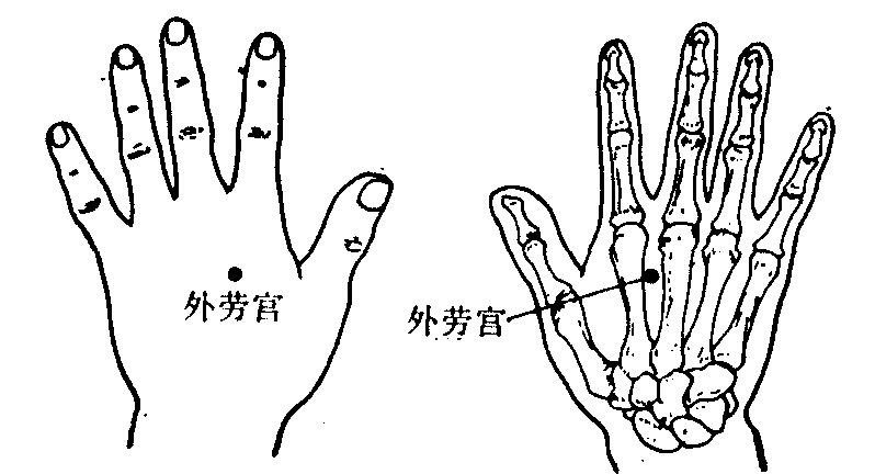 外劳宫经外奇穴名。出《小儿推拿方脉活婴秘旨全书》。位于手背中央,与掌心劳宫穴相对处。主治落枕,五谷不消,腹痛泄泻,掌指麻痹,五指不能屈伸,小儿脐风,手背红肿发痛等。直刺0.5~1寸。艾炷灸1~3壮; 或艾条灸3~5分钟。 外劳宫wàiláogōng经外奇穴名。代号EX - UE8。见《小儿推拿方脉活婴秘旨全书》。位于手背, 第二、三掌骨之间, 掌指关节后约0. 5 寸。主治小儿消化不良, 落枕,掌指麻痹等。直刺0. 5 ~ 0. 8 寸, 灸1 ~ 3 壮或3 ~5 分钟。 外劳宫 外劳宫奇穴。首见《小儿推拿方脉活婴秘旨全书》。别名落枕、项强。位于手背侧,第二、三掌骨间,指掌关节后0.5寸之凹陷中。伏掌,微握拳取之。局部有骨间背侧肌,掌背侧动、静脉,手背静脉网;并有桡神经的手背支。一般直刺0.5~0.8寸。针后局部痠胀或有麻电感向指端传导。