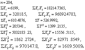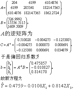 按α=0.05水准,可认为X1、X3与Y有线性关系,而X2没有。 (3)将X2剔除,重新建立新的回归方程。仍用逆矩阵法,系数矩阵A与常数项矩阵B为
