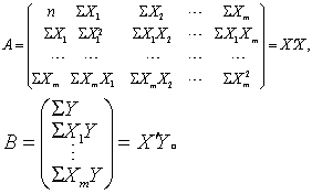 式中X、Y为相应观察值的资料矩阵,式中X12为X2的第1个观察值,余类推。 式(2)中的系数矩阵A及常数项矩阵B分别为