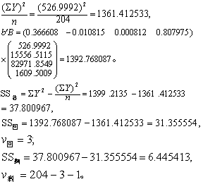 如所计算得的m个ti值中有一个或几个小于tα(n-m-1)时,相应的自变量Xi就被认为在方程中不起什么作用,应先把最小的与ti值相应的Xi从方程中剔除出去,然后重新建立新的回归方程,再对新的偏回归系数进行检验,直到方程内的偏回归系数都有显著性时为止。 例2 对例1所求得的回归方程作线性假设检验,若结果有显著性,则进一步作偏回归系数的假设检验;需要时,重新建立新的回归方程,再对新方程作线性假设检验;直到方程内的偏回归系数都有显著性时为止。 (1)例1所得回归方程的线性假设检验。 H0: β1=β2=β3=0, H1: βi (i=1,2,3)不为零或不均为零。 α=0.05。 按式(5)~(8),由例1资料,
