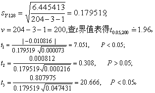 查F界值表,P<0.01,按α=0.05水准拒绝H0,接受H1,表明例1的回归方程有显著性,故可认为方程是有效的。 (2)偏回归系数的假设检验。按式(9)、(10)得: