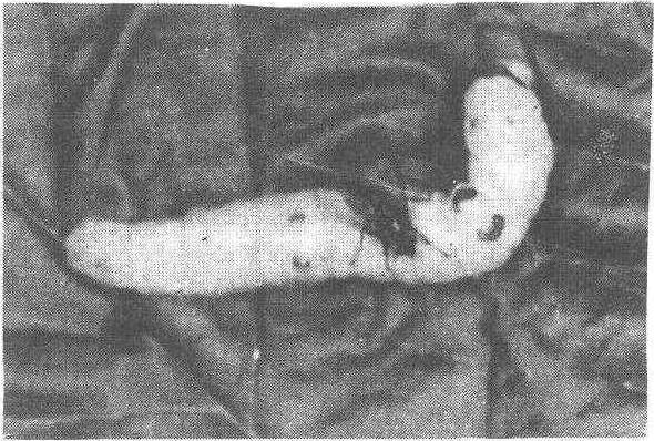 图5 多化性蚕蛆寄生病斑 防治 主要措施是用“灭蚕蝇”药剂300倍液,于5龄起蚕饷食后第2天、第4天、第6天各喷施蚕体1次,可杀死蝇卵和蚕体内蝇蛆。蝇害严重季节可在3、4龄各喷药1次。也可用500倍稀释液以1∶10重量比和桑叶掺匀后喂饲,但对该药过敏的蚕品种较不安全。此外,在种茧育过程中采取设纱窗防蝇,丝茧育蚕茧及时烘茧杀蛆和杀灭越冬蛹等措施,减少成虫基数的措施,可提高防治效果。 |
