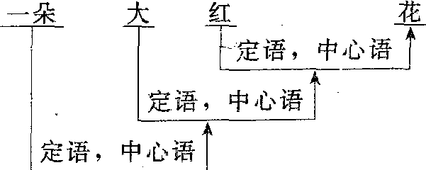 | 释义 | 多层定语又称多项定语、递加定语。指同中心语有关而层次不同的几个定语,几个定语依次修饰中心语,前面几个(除最后一个)定语的中心语也是偏正短语。如“一朵大红花”的三个定语“一朵”、“大”和“红”,首先是“红”修饰“花”,其次是“大”修饰“红花”,再次是“一朵”修饰“大红花”。内部结构是: