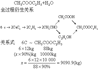 例2 用含碳90%的焦炭制取电石,再进一步制取乙酸乙酯,问在理论上制取乙酸乙酯10000 kg需要这种焦炭多少公斤?