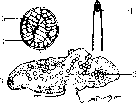 多腔菌属 1.子囊孢子释放 2.子囊孢子 3.子囊 4.子囊座 5.子囊腔 |