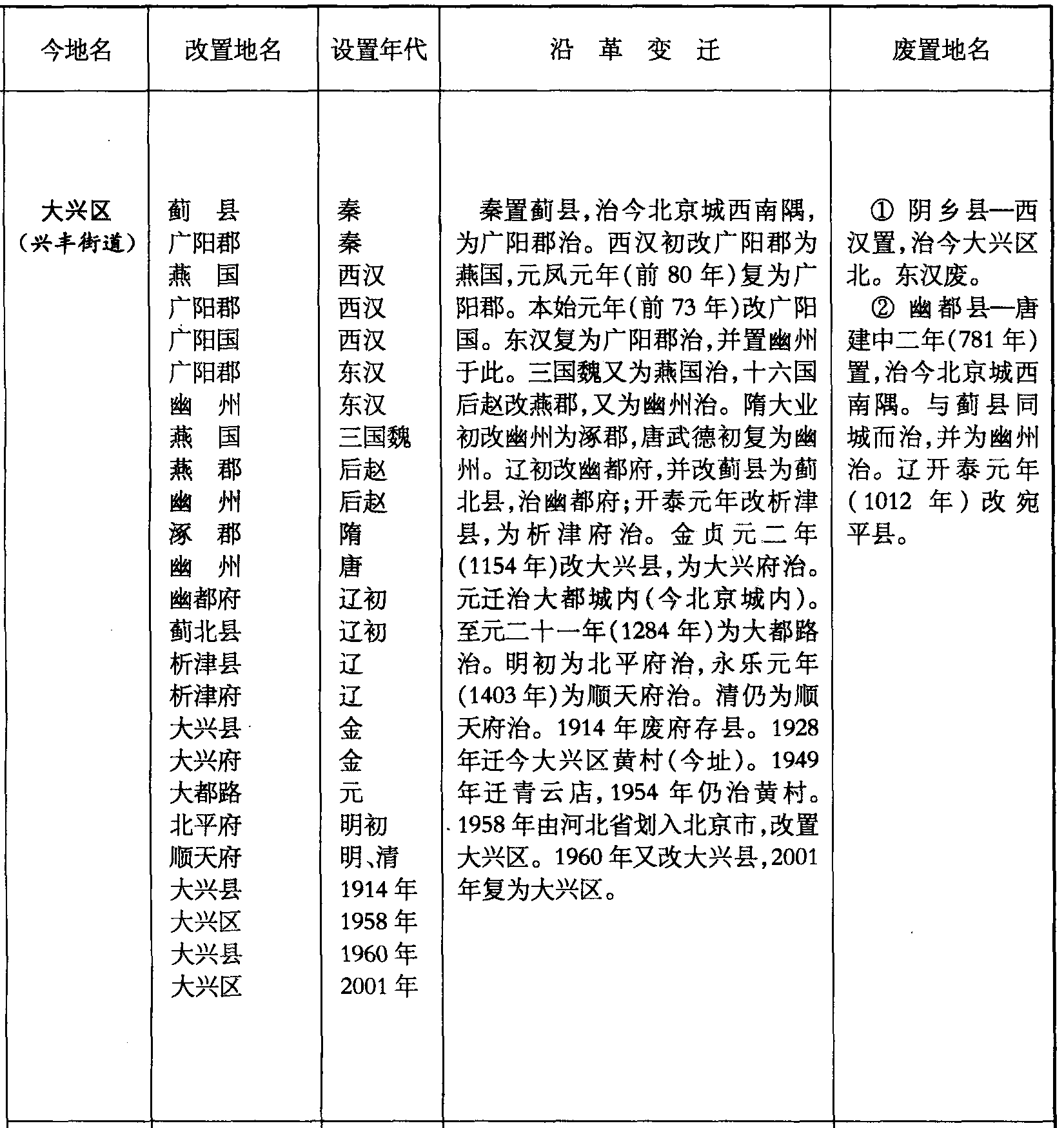 秦置蓟县,治今北京城西南隅,为广阳郡治。西汉初改广阳郡为燕国,元凤元年(前80年)复为广阳郡。本始元年(前73年)改广阳国。东汉复为广阳郡治,并置幽州于此。三国魏又为燕国治,十六国后赵改燕郡,又为幽州治。隋大业初改幽州为涿郡,唐武德初复为幽州。辽初改幽都府,并改蓟县为蓟北县,治幽都府;开泰元年改析津县,为析津府治。金贞元二年(1154年)改大兴县,为大兴府治。元迁治大都城内(今北京城内)。至元二十一年(1284年)为大都路治。明初为北平府治,永乐元年(1403年)为顺天府治。清仍为顺天府治。1914年废府存县。1928年迁今大兴区黄村(今址)。1949年迁青云店,1954年仍治黄村。1958年由河北省划入北京市,改置大兴区。1960年又改大兴县,2001年复为大兴区。