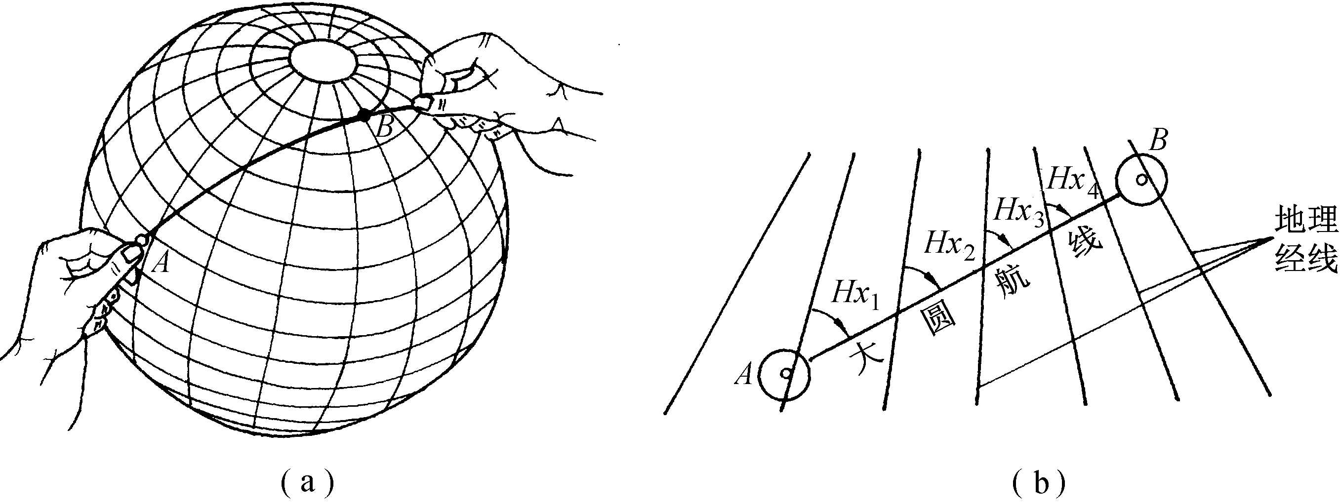 大圆航线(a) 在地球仪上的大圆航线示意图;(b) 在国际标准投影航图上的大圆航线示意图