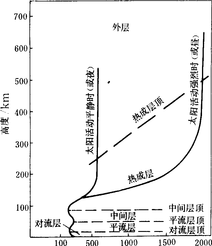 大气的垂直分层 通常根据温度随高度分布的特性及外层空气特点,把大气分成对流层、平流层、中间层、热成层、外层,如图3所示。