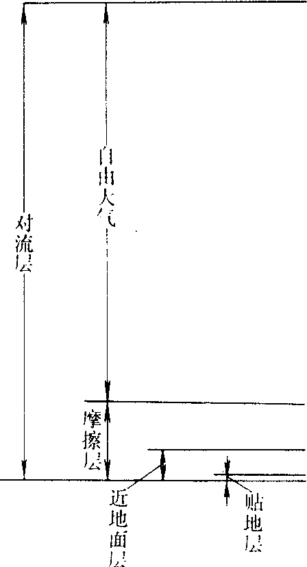 温度/K 图3 大气层温度的垂直分布和分层 对流层 位于大气下部。其底与地表面相接,其厚度在赤道处达17~18公里,在中纬度平均是12公里左右,在极地则降至8公里左右。其中空气质量占了整个大气质量的4/5。对流层内温度随高度增加而降低。虽然温度的下降率随时间、地点而异,在某些特殊气层内常有温度随高度增加而增大的逆温现象。但一般而言,随着高度的增加有5~7℃/公里的减低率,平均减低率是6.5℃/公里。温度随高度下降的原因是由于地面能吸收到达地面的大部分太阳辐射,然后放出长波辐射,加热空气。因此相对于对流层空气来说,地面是一个热源。对流层内存在大量的湍流和对流。云、雾、降水以及猛烈风暴均发生在这一层内。对流层大气按离地面高度又可分为贴地层、近地面层、摩擦层(行星边界层)及自由大气等四个层次(图4)。❶贴地层是从地面到离地约两米以下的气层。它受地面的影响最大,温度随高度及时间的变化最为激烈。白天地面的强烈增温作用使层内的垂直温度递减率常远大于10℃/公里;夜间地面强烈辐射冷却,层内会出现强烈逆温。由于接近地面,所以岩石、土壤内的放射性气体(如氡与钍射气)及生物作用产生的气体都会影响本层下部的大气成分。温度水平分布也受地面强烈影响,顶部温度的水平分布较底部均匀,在适当选择地点后,其温度能代表相当大范围内的气温。在地面测温时百叶箱中的温度表球部规定放在本层顶部高度处。 ❷近地面层是从地面到高约100米左右的气层。它在下垫面的影响下,气象要素及其梯度均有明显的变化。空气流动也有明显的湍流特点。层中热量、水汽、动量的垂直湍流输送通量随高度的变化不明显,其顶部是这些垂直湍流输送通量随高度无明显变化区的上限高度。 ❸摩擦层又叫行星边界层,是从地面到高约500~2000米的气层。其中上部垂直湍流输送通量随高度的变化已趋明显,地面摩擦影响及热力影响渐渐减弱。 ❹自由大气。行星边界层以上的那部分对流层属自由大气,那里基本上已不受地面摩擦影响。在中高纬度,风已服从地转风或梯度风法则,即气流几乎平行于等压线。地面的温度日变化对本层的影响很小,但地面温度的年变化对本层仍有影响。