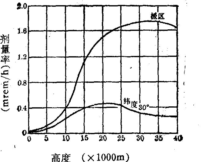 不同纬度地区上空,银河宇宙线辐射剂量率随高度变化的情况 宇宙线的生物学效应首先与为生物组织所吸收能量的多少有密切关系。生物组织吸收能量的多少可用吸收剂量表示,专用单位是“拉德”(rad),其定义为:凡每克物质(包括生物组织)吸收射线的能量为100尔格(erg)时,其吸收剂量即为1rad。当吸收剂量一定时,生物效应还与辐射的类型、能量和辐照条件等因素有关。为了将吸收剂量与生物效应的程度更好地联系起来,还必须引入适当的修正因子。经过修正的吸收剂量称“剂量当量”。其定义为: 剂量当量H是吸收剂量D与品质因子Q及其他修正因子N的乘积,即H=DQN,专用单位为“雷姆”(rem,人体伦琴当量)。 国际辐射防护委员会(ICRP)1967年所规定的最大容许剂量为:从事辐射职业的工作人员,5000mrem/年;一般人员,500mrem/年。下表给出飞机在不同纬度、高度、分别以不同速度飞行16000km航程时所受到的银河宇宙线剂量当量值。表中数据说明,在飞机飞行高度,人体所受到的银河宇宙线的剂量当量是比较低的,而且随着巡航高度的升高和飞行速度的加大,总的暴露剂量反而下降。据报道,乘协和式超音速客机(航行高度为15~18km)往返于巴黎与华盛顿之间(属于高纬度地区),一般旅客若按每月往返一次计算,累积剂量率一年不超过150mrem;机组人员,若按每人每年飞行500小时计算,累积剂量率为一年1250mrem。美国联邦航空局(FAA)和国家航空航天局(NASA)曾联合对1973年的299万次国内民航飞行时的暴露剂量进行了测量,结果是:平均飞行高度为9.47km,旅客的平均剂量率为2.82mrem/年,机组人员的平均剂量率为160mrem/年。以上表明:在超音速民航客机和亚音速民航客机的航行高度,机组人员和旅客在航行过程中所接受到的银河宇宙线剂量,均未超过国际辐射防护委员会规定的最大容许剂量标准。 在不同纬度、高度和速度条件下航行16000km的辐射暴露剂量 (mrem/16000km航程)