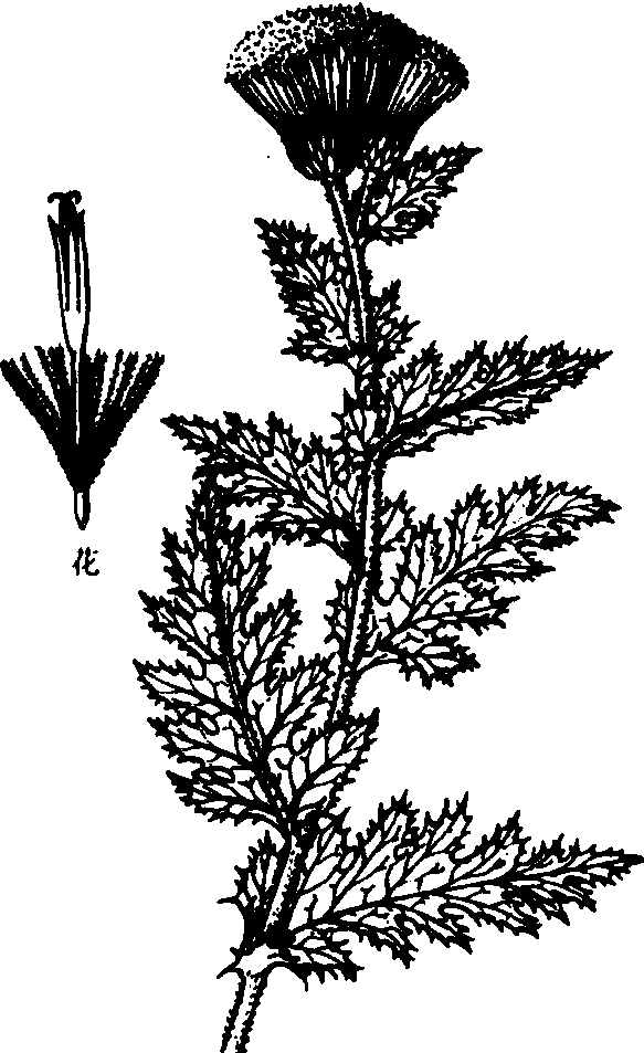 大薊 大蓟【同义】总目录 大蓟马蓟 大蓟herba cirsii japonici止血药。出《本草经集注》。见《抱犊集》。又名千针草、野红花(《本草纲目》)。为菊科植物大蓟Cirsium japonicum DC.的全草或根。拣去杂质, 清水洗净, 润透, 切段或切片晒干。生用或炒炭用。中国大部分地区均产。甘,凉。入肝、脾经。功能凉血止血, 祛瘀消肿。主治: ❶血热妄行引起的衄血、尿血、便血、子宫出血, 与生地黄、蒲黄、侧柏、牡丹皮等配伍。 大蓟Japanese thistle中国夏秋季优良的杂草蜜源植物。学名Cirsium japonicum DC.。别名刺蓟菜。菊科。多年生草本植物。茎直立,高50~100厘米。基生叶有柄,叶片矩圆形或披针状长椭圆形;中部叶无柄,叶片具羽状深裂。头状花序单个生于茎或枝顶端,花紫红色。蜜腺位于花冠内子房基部。瘦果长椭圆形。(见图)