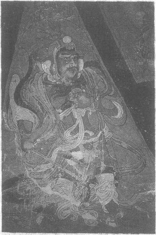 西夏。纵约1.5米。甘肃省肃南裕固族自治县文殊山石窟万佛洞东壁壁画。此天王为护法神四大金刚之一。浓眉大眼,面容粗犷,戴头盔,着战袍,右手持宝剑一柄,分腿而立。身材粗壮魁梧,表情庄严,凝视前方,是一个身经百战的武将形象。缠身的衣带飘舞,为他的英姿平添了几分潇洒。线条流畅自由,绘画技艺娴熟。