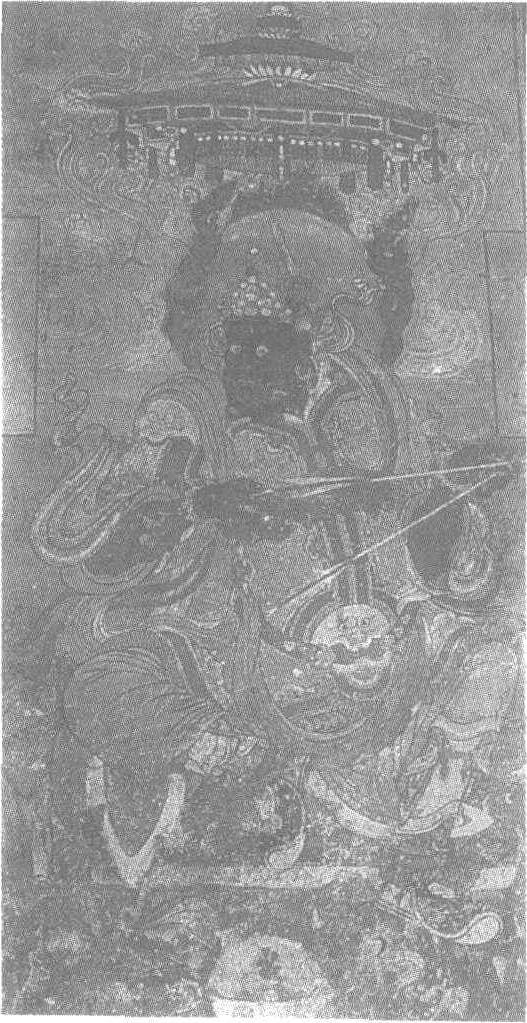 辽。纵315厘米,横163厘米。山西省应县佛宫寺释迦塔底层前槽西八字墙壁画。天王是释迦牟尼的护法神,在中国的佛教艺术中多有所见,寺庙中常见的有护世四天王的形象。此天王为坐式,右腿蜷曲,左腿半伸,头顶上方有繁丽的华盖,头后有火焰纹头光。身披战袍,前襟腹部饰兽面图案。身负弯弓,手握两支箭,怒目斜视,威猛僄悍。作者使用工笔重彩,线条刚劲活泼,色彩夺目。其脸庞及裸露的部分双臂肌肤呈黑褐色,以渲染他的刚健气势,产生了强烈的艺术效果。佛宫寺释迦塔见“佛宫寺释迦塔”条目。