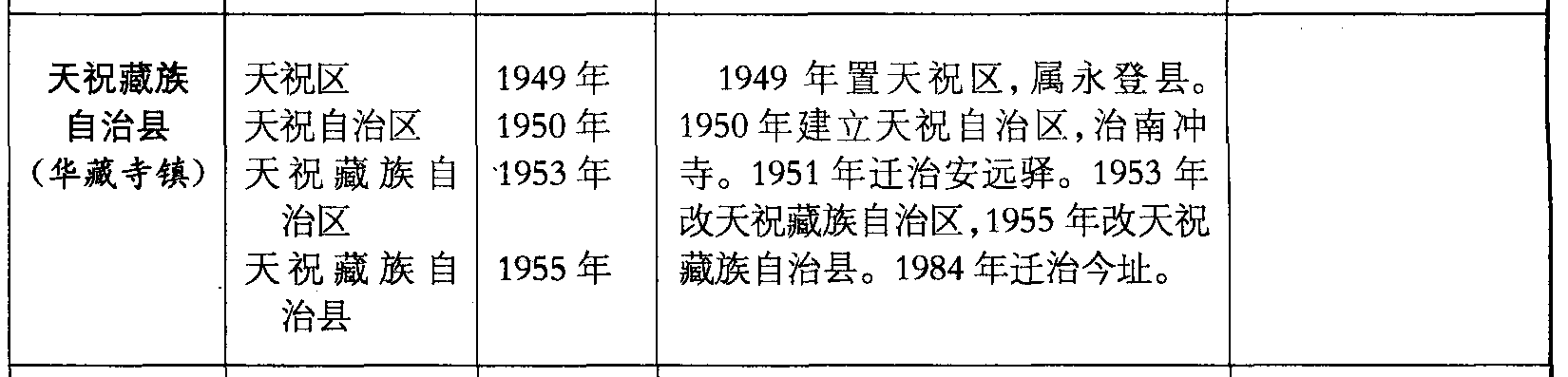 天祝藏族自治县(华藏寺镇)天祝区天祝自治区天祝藏族自治区天祝藏族自治县1949年1950年1953年1955年1949年置天祝区,属永登县。1950年建立天祝自治区,治南冲寺。1951年迁治安远驿。1953年改天祝藏族自治区,1955年改天祝藏族自治县。1984年迁治今址。