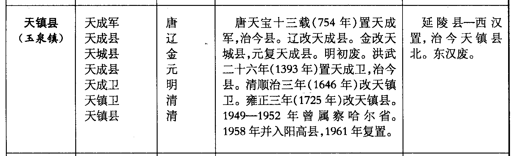 天镇县(玉泉镇)天成军天成县天城县天成县天成卫天镇卫天镇县唐辽金元明清清唐天宝十三载(754年)置天成军,治今县。辽改天成县。金改天城县,元复天成县。明初废。洪武二十六年(1393年)置天成卫,治今县。清顺治三年(1646年)改天镇卫。雍正三年(1725年)改天镇县。1949—1952年曾属察哈尔省。1958年并入阳高县,1961年复置。延陵县—西汉置,治今天镇县北。东汉废。